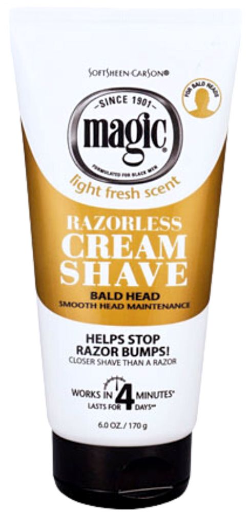 Softsheen-Carson Magic Razerless Cream Shave enthält Sheabutter und Süßmandelöl und wurde speziell entwickelt, um Hautirritationen und Rasierpickel zu bekämpfen. Die Creme wirkt bereits nach 4 Minuten und hält bis zu 4 Tage lang. Sie hat einen milden, angenehmen Duft. Besonders geeignet für Menschen mit Glatze.